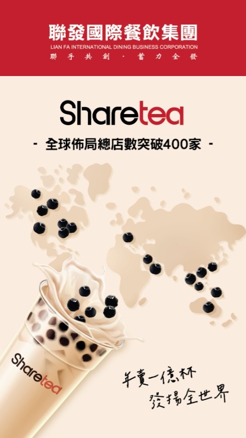 「聯發國際餐飲集團」以茶飲品牌《Sharetea歇腳亭》進軍國際,創下年賣上億杯銷售奇蹟。